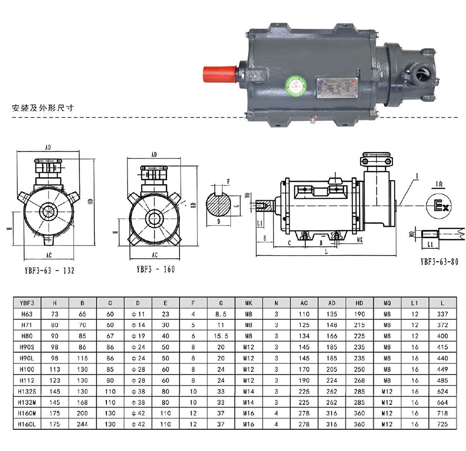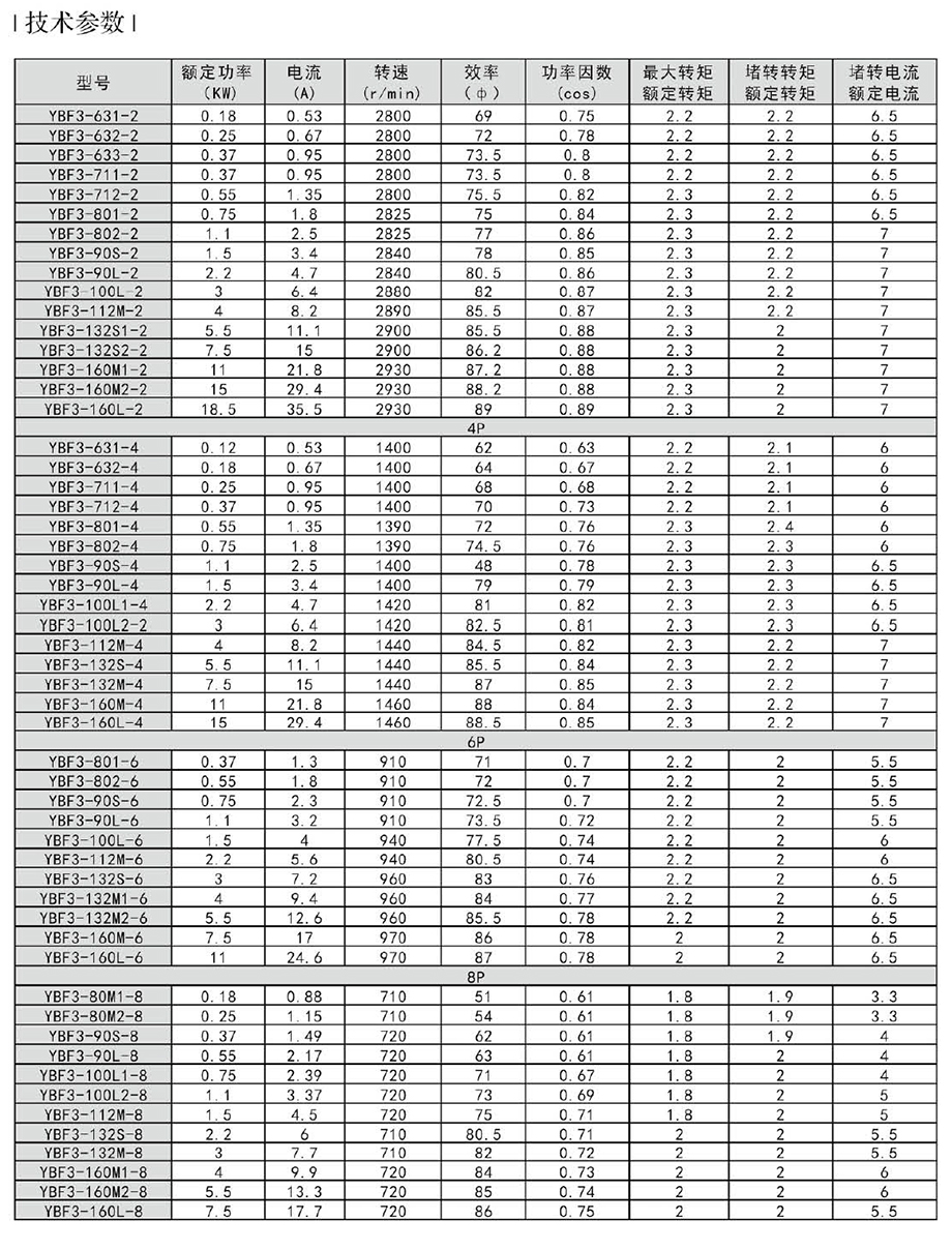 YBF3防爆電機是專為配套隔爆型通風(fēng)風(fēng)機而設(shè)計開發(fā)的新產(chǎn)品,具有體積小、重量輕、效率高、噪聲低、振動小、運行安全可靠、使用維護方便等特點。YBF3防爆電機的功率等級、安裝尺寸符合我國標(biāo)準(zhǔn)和國際電工委員會IEC標(biāo)準(zhǔn),具有當(dāng)代國內(nèi)領(lǐng)先的技術(shù)水平。YBF3系列風(fēng)機用隔爆型三相異步電動機執(zhí)行標(biāo)準(zhǔn)GB3836.1-2010《爆炸性環(huán)境用電氣設(shè)備第2部分:隔爆型“D”MT451-1995煤礦用隔爆型低壓三相異步電動機安全性能通用技術(shù)規(guī)范》。主要性能符合《隔爆型三相異步電動機技術(shù)條件第5部分YBF3系列風(fēng)機用隔爆型三相異步電動機(機座號63-355)》的規(guī)定,防爆標(biāo)志為EXDBIBT4、EXDIBT4(原標(biāo)志為EXD),主要作為風(fēng)機的原動機使用。適用于煤礦井下非采掘面具有甲烷可燃性氣體或煤礦與空氣形成爆炸性氣體環(huán)境的場所。電動機的額定電壓為380V、660V、380/660V、660/1140V,額定頻率50HZ。
