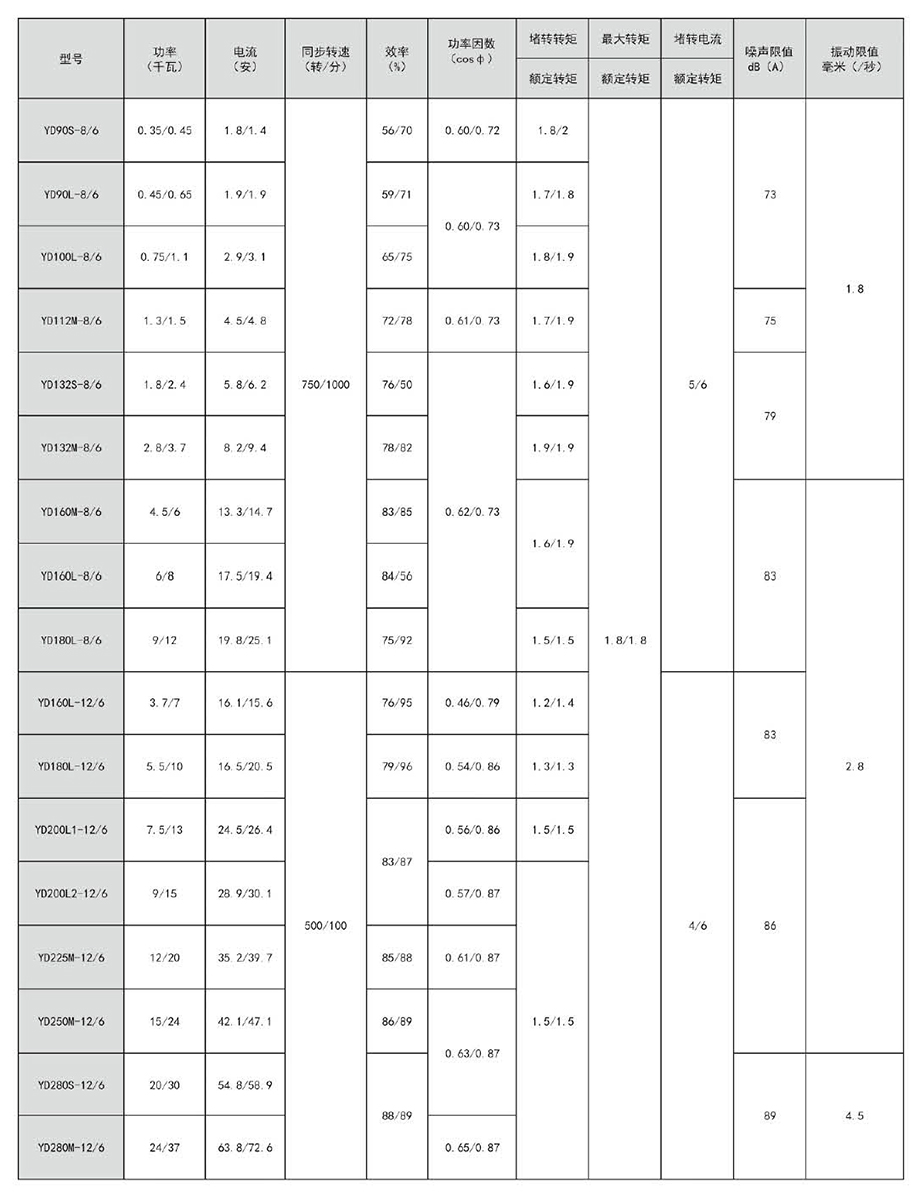 YD系列變極多速三相異步電動機可以與手動控制、接觸器、控制器械等一起進行速度控制,節(jié)約大量電能。采用改變繞組的接法來變換電機的轉(zhuǎn)速和輸出功率,使期與機械設(shè)備的負載特性相匹配,簡化了變速系統(tǒng),高效,節(jié)能。本系列電機轉(zhuǎn)速有雙速、三速和四速三種,極數(shù)比有412、6/4、8/4、12/6、6/4/2、8/4/2和8/6/4、12/8/6/4等九種,其主要性能指標(biāo)和國外同類產(chǎn)品的先進水平相當(dāng),較老系列有較大提高。